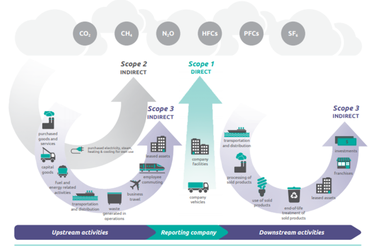 Scope 1, 2 et 3 selon le standard international, GHG Protocol, qui cartographie les différentes sources d’émissions de gaz à effet de serre. Greenhouse gas protocole