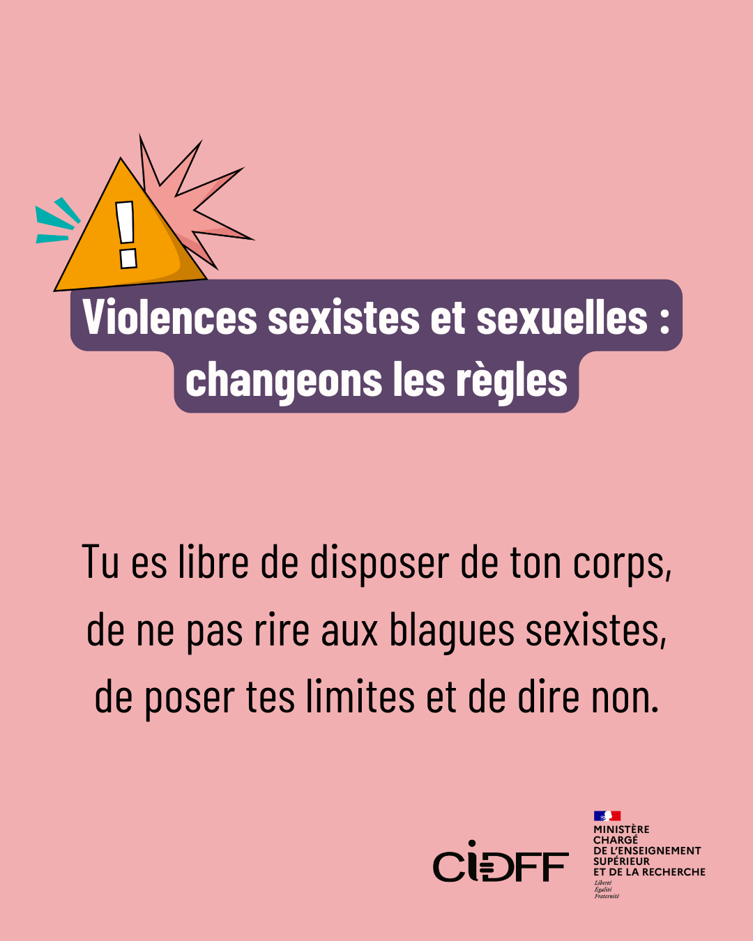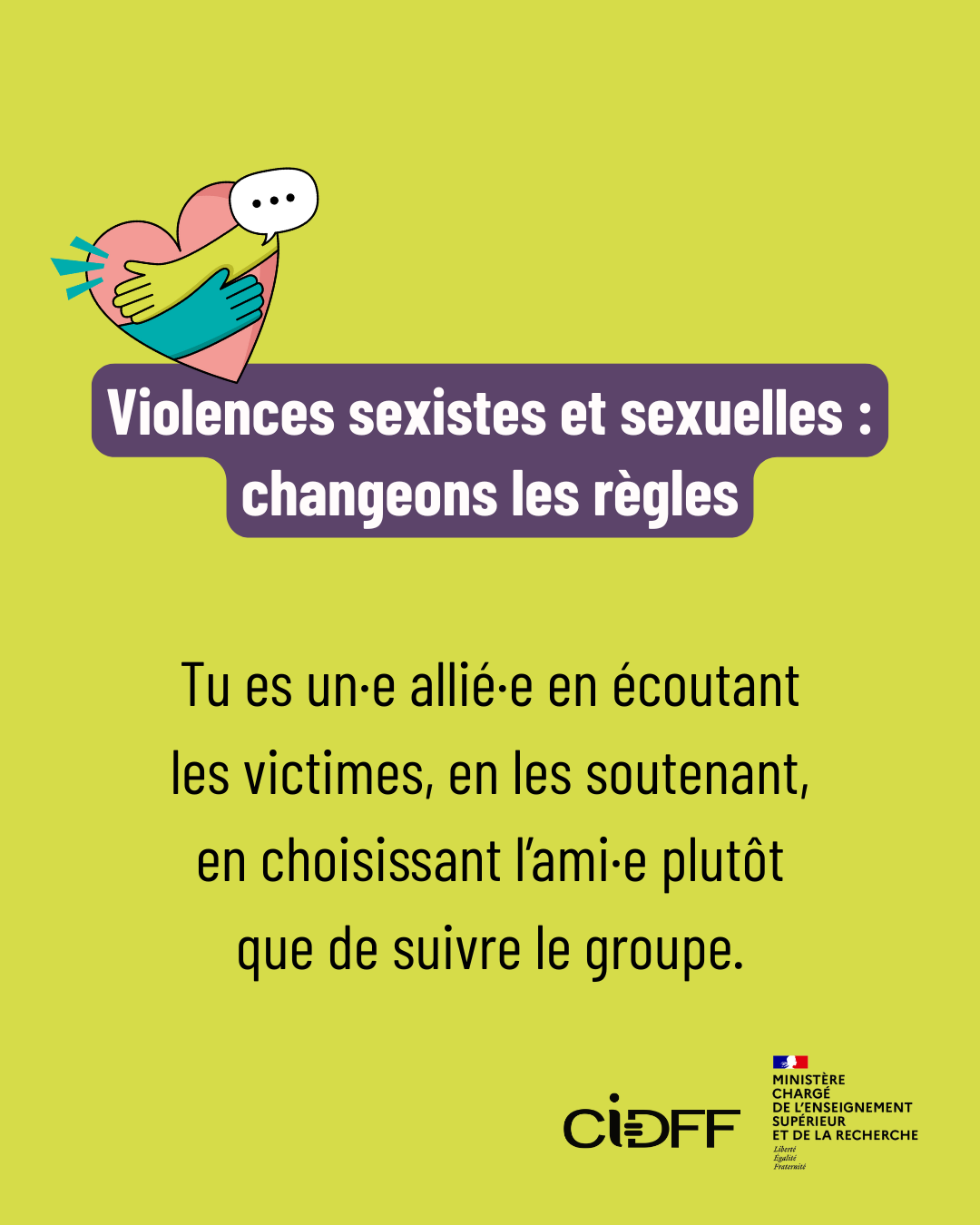 Pour répondre à ces enjeux, la Fédération nationale des centres d’information sur les droits des femmes et des familles (CIDFF), en partenariat avec le ministère de l’Enseignement supérieur, de la Recherche et de l’Espace, a lancé une campagne nationale de sensibilisation destinée aux étudiants. Son objectif est d’aider à mieux reconnaître les violences sexistes et sexuelles, mais aussi de faire connaître les ressources existantes et les solutions pour agir.